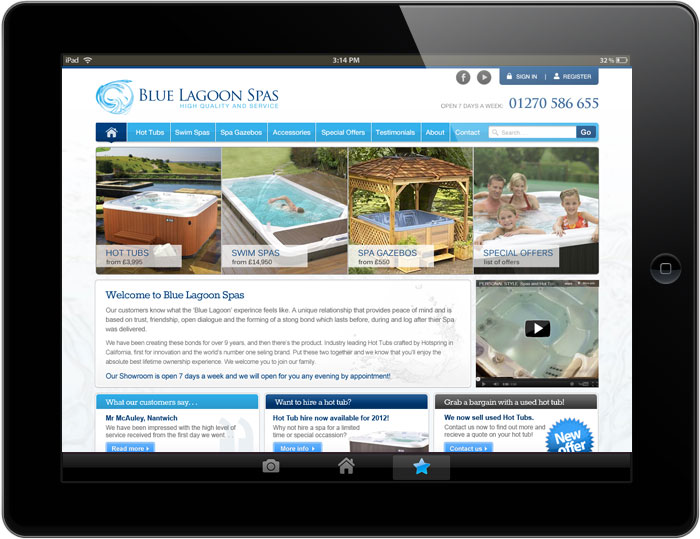 Blue Lagoon Spas, Cheshire were in search of a complete re-brand and a new web design. Their brief was to create a professional and functional website to display their wide range of luxury hot tub spas, whilst keeping an easy to use format for their all important customers.